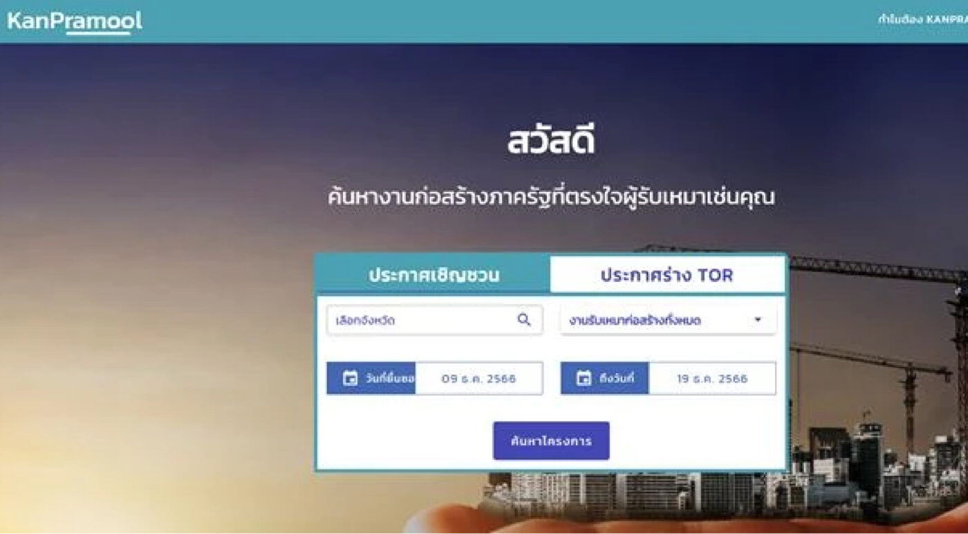 - Kanpramool (www.kanpramool.com) อีกหนึ่งแพลตฟอร์มสำคัญที่ช่วยหางานให้ผู้รับเหมา ผ่านช่องทาง เว็บไซต์และ LINE โดยรวบรวมงานประมูลต่างๆทั่วประเทศไว้ให้